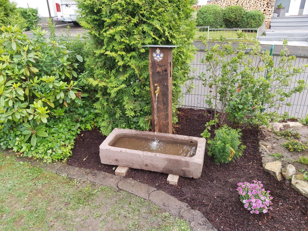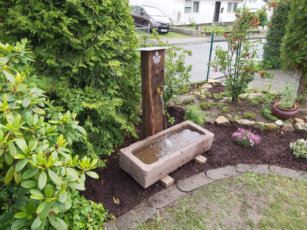 Hier mal ein Beispiel eines Brunnens: Dieser ist gefertigt aus einer antiken Eichendiele und einem alten Sandsteintrog. Ein alter Bierzapfhahn aus Messing sorgt für die Wasserversorgung. Ein Wasserbehälter mit integrierter Pumpe ist neben dem Brunnen im Boden eingelassen. Dadurch ist dieser Brunnen autark.
